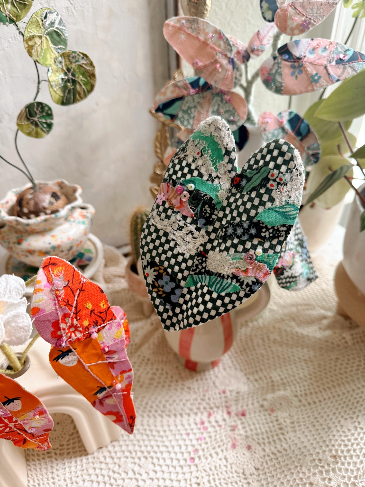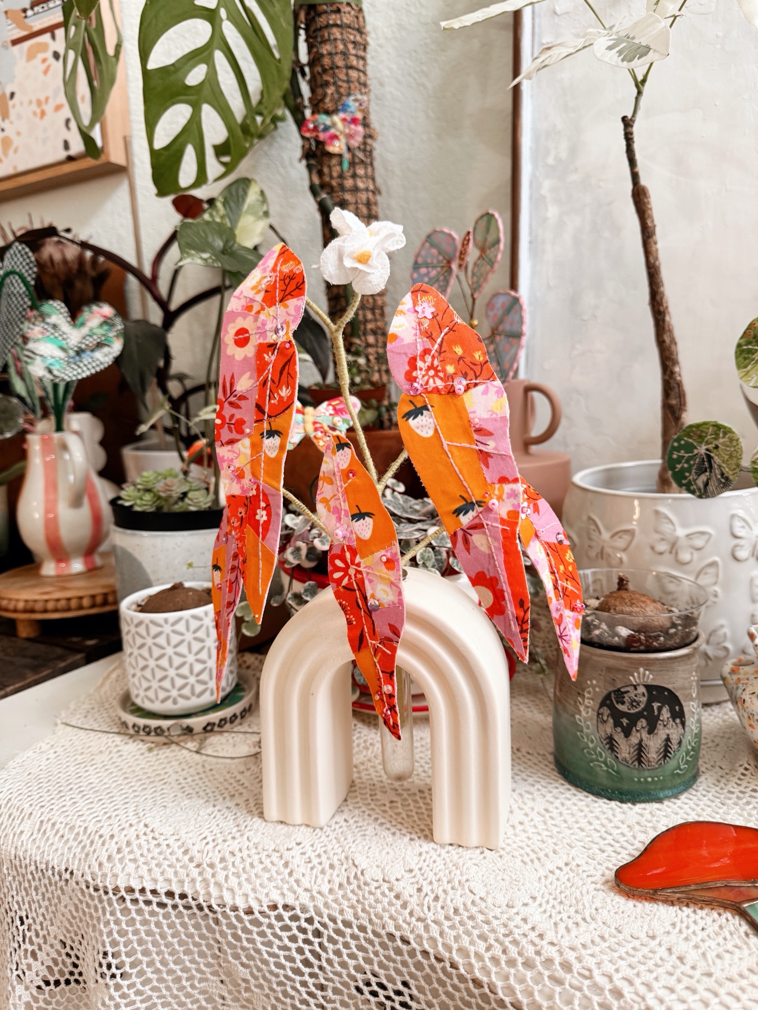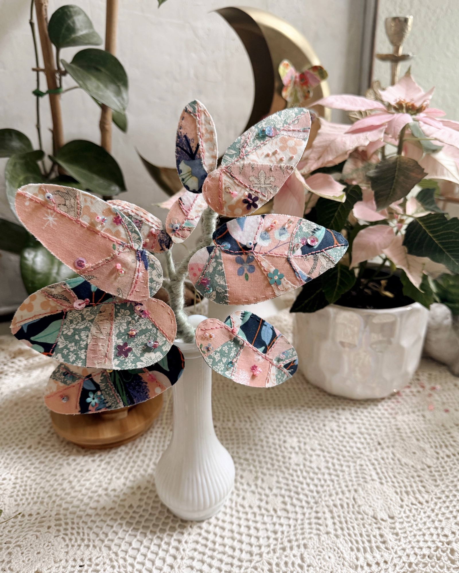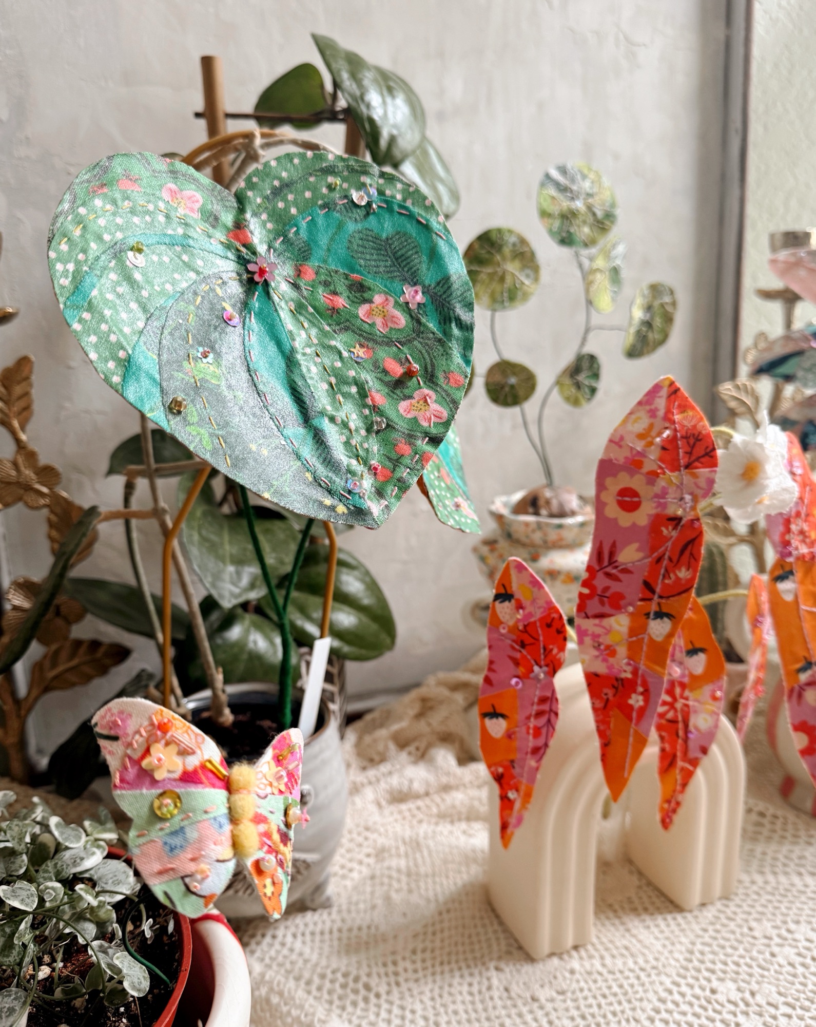 To satisfy my never ending wishlist of wonderful plants, I stitched and sculpted whimsical plants grown from fabric and wire. I love filling my indoor garden with these mixed media stems and winged creatures.