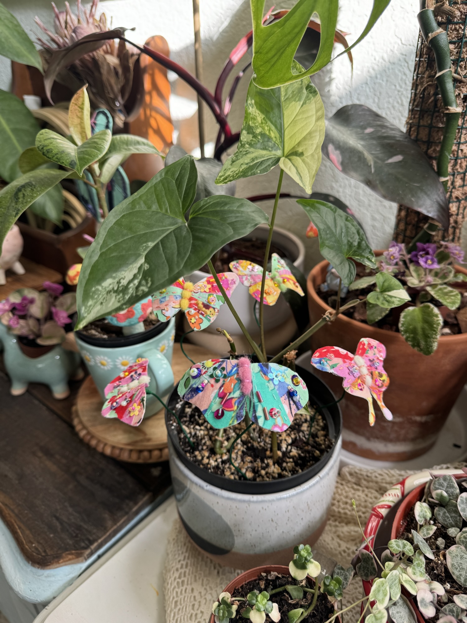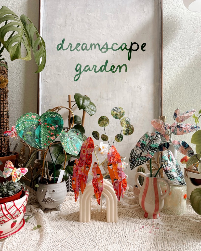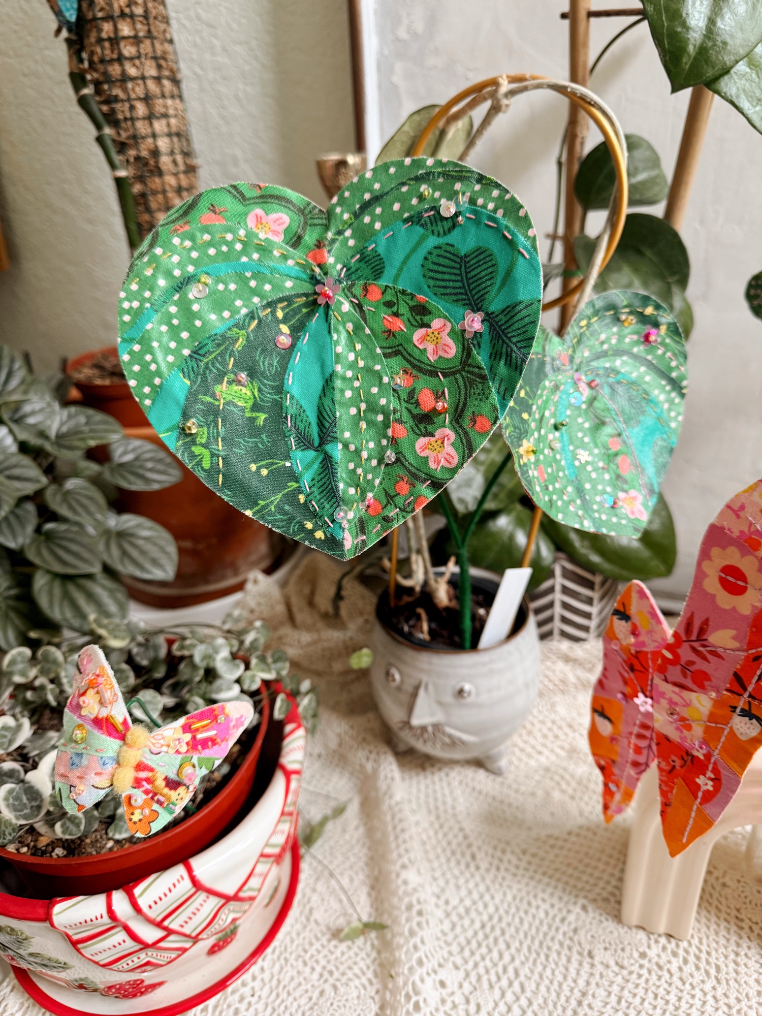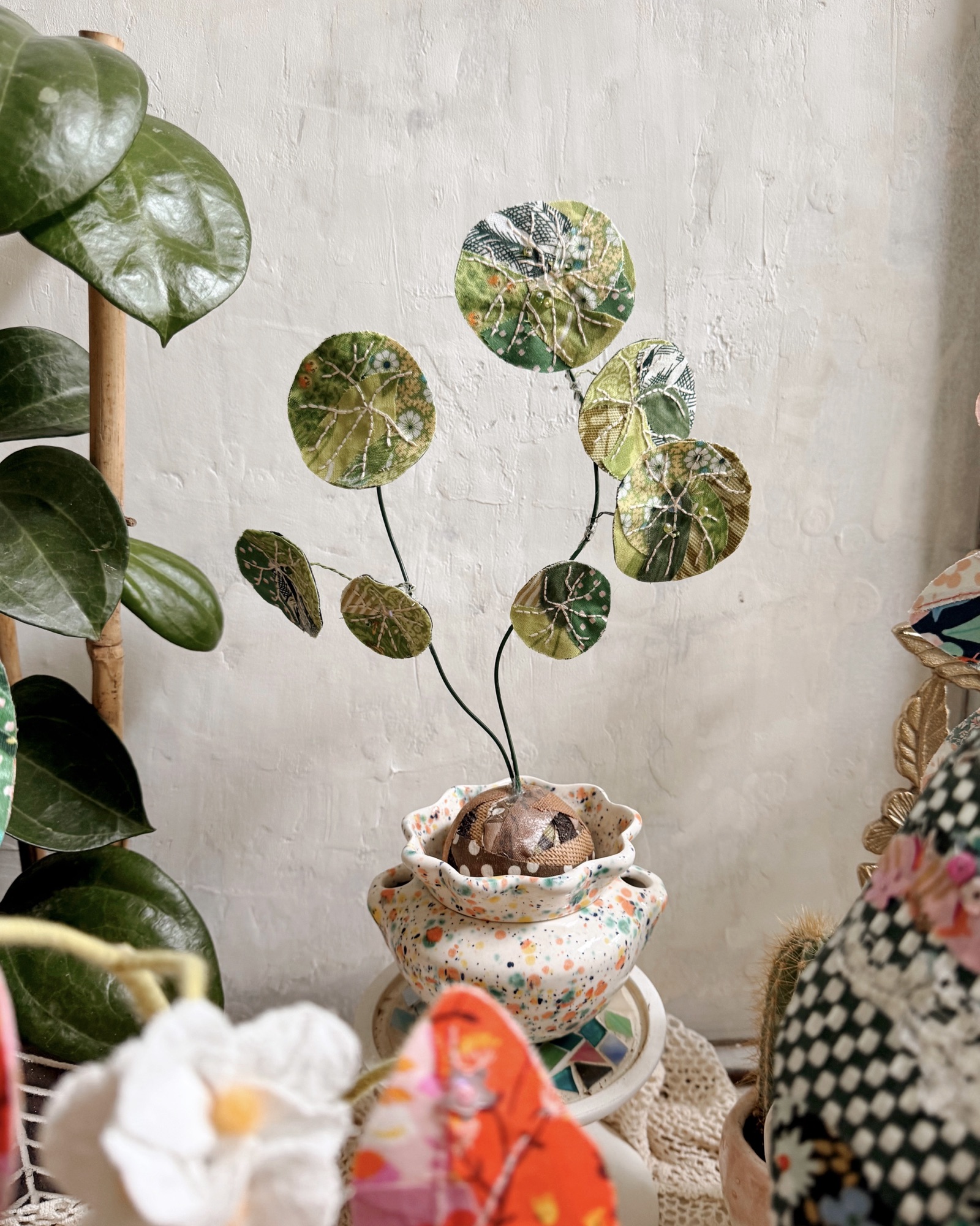 To satisfy my never ending wishlist of wonderful plants, I stitched and sculpted whimsical plants grown from fabric and wire. I love filling my indoor garden with these mixed media stems and winged creatures.