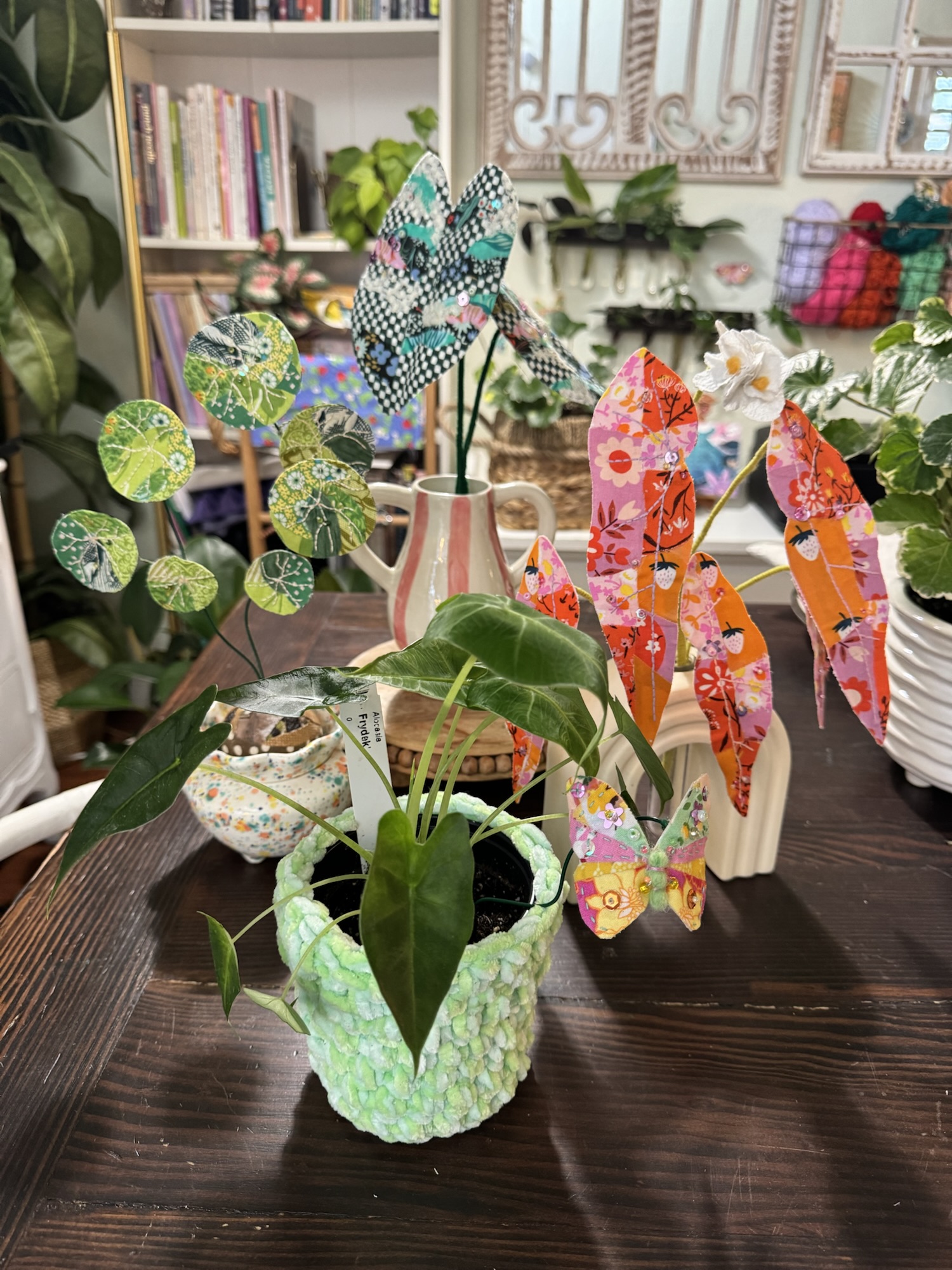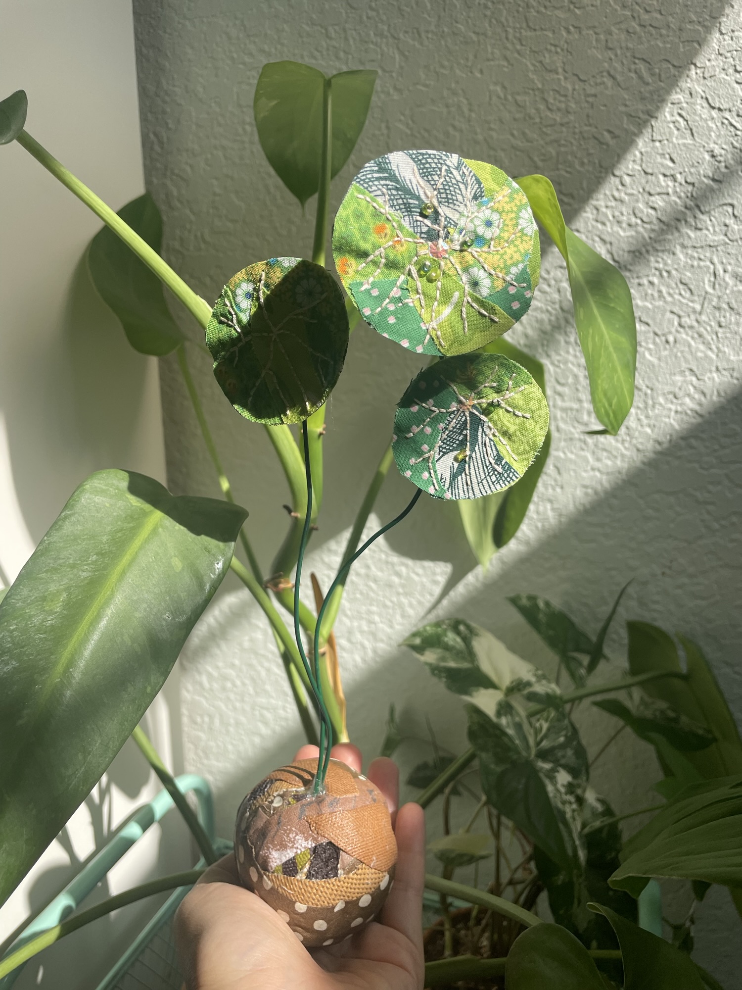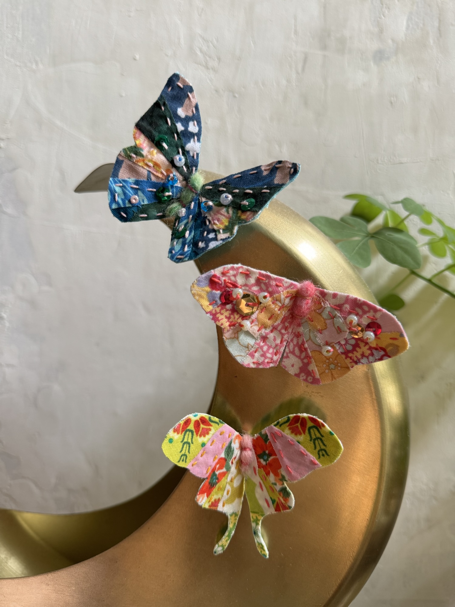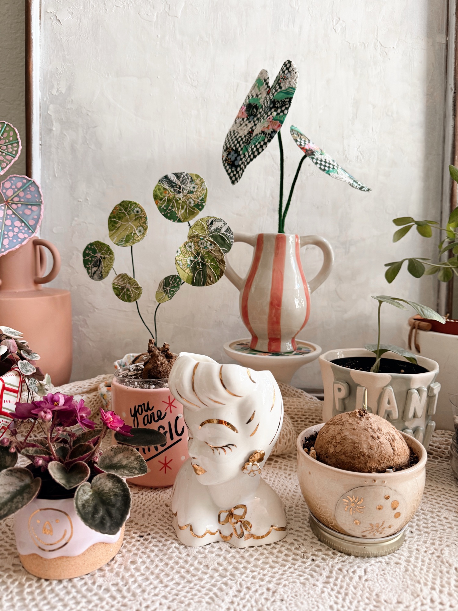 To satisfy my never ending wishlist of wonderful plants, I stitched and sculpted whimsical plants grown from fabric and wire. I love filling my indoor garden with these mixed media stems and winged creatures.